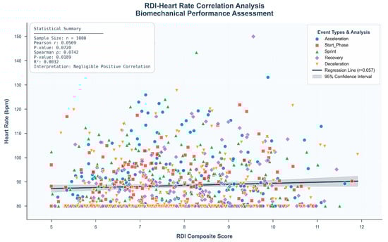 This figure demonstrates that the Rhythm Disturbance Index (RDI) remains largely independent of heart rate across different activities and participants. The regression line is nearly flat, and the overall correlation is weak and statistically non-significant (Pearson r = 0.0742, p > 0.05). The event-specific color patterns reveal no systematic increase in RDI with higher heart rates, indicating that cardiovascular load does not substantially influence rhythmic disturbance. Collectively, these results confirm the HR-independent nature of RDI and reduce concerns about heart rate acting as a confounding variable.