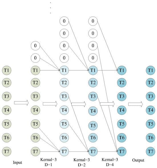 The temporal convolutional network (TCN) [46] is a convolutional neural network architecture dedicated to processing temporal data. By combining causal convolution, dilated convolution and residual connection, the TCN maintains the advantages of efficient parallel computing of convolutional neural networks. It overcomes the defect of a traditional CNN that struggles to capture long-term dependence. Compared with the traditional recurrent neural network (RNN) and its classical variants, the TCN has the following advantages in processing long sequence data: firstly, the parallel computing features greatly improve the training efficiency of the TCN; and secondly, the TCN can effectively capture the features of different time scales through the well-designed dilated convolution structure. Finally, the introduction of residual connection solves the problem of gradient vanishing in deep network training. These features enable the TCN to show excellent performance in speech recognition, action prediction, temporal prediction, and other fields. The core structure of the TCN is as follows:
