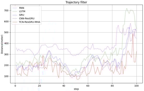 Experimental results show that each module of the model has a positive effect on the track filtering algorithm, and the importance of each module is in the following order: ResGRU1 network, TCN-ResGRU network, ResGRU2 network, and MHA mechanism. The MHA mechanism has the least improvement on the track filtering effect, and the MHA mechanism can be retained when the application scenario has high requirements on the filtering effect and low requirements on the model operation efficiency. When the application scenario has low requirements for the filtering effect and high requirements for the model operation efficiency, the MHA mechanism can be abandoned.