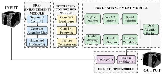 As shown in Figure 2, the Dynamic Buffer–Bottleneck–Buffer Layer comprises three main components: pre-enhancement, bottleneck compression, and post-enhancement. The pre-enhancement module employs Sigmoid activation and 1 × 1 convolution to generate attention maps, enhancing feature responses through element-wise multiplication. The bottleneck compression module utilizes 3 × 3 depthwise separable convolution followed by 1 × 1 pointwise convolution to achieve efficient feature compression. The post-enhancement module leverages both average pooling and max pooling to extract spatial attention, which is then combined with channel attention derived from fully connected layers to enable comprehensive feature enhancement. Finally, the enhanced features are integrated with the original input through upsampling and residual connections to produce the final output.