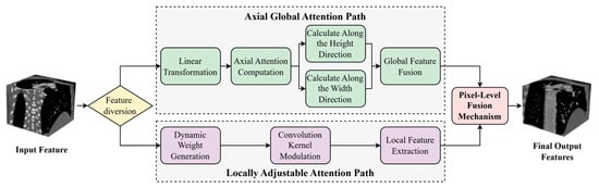 Coronary arteries in medical images typically exhibit long-range extensibility and structurally complex and variable characteristics. Particularly in lesion regions such as bifurcations, stenoses, and calcifications, they are often accompanied by minute and irregular local morphological changes. In traditional deep learning segmentation methods, downsampling operations frequently encounter issues of information loss and reduced accuracy when processing these fine vascular structures. Moreover, the heterogeneity of vascular pathology and inter-patient anatomical variability necessitate adaptive feature representation across diverse morphological patterns. Imaging artifacts and low contrast ratios further compromise feature extraction, particularly in subtle pathological regions. Conventional attention mechanisms lack the flexibility to dynamically balance global topology and local details according to structural complexity. Therefore, how to simultaneously balance global spatial consistency and local structural accuracy has become the key to solving the problem. To this end, this study proposes an Axial Local–global Hybrid Attention (ALHA) module. By combining global attention and local attention mechanisms, this module can simultaneously preserve the consistency of global spatial information and enhance the recognition capability of local details. The module features a dual-path parallel processing architecture that effectively handles both large-scale structures and minute lesion segmentation of coronary arteries, with dynamic modulation through a pixel-level fusion mechanism, thereby improving the precise segmentation capability for complex coronary artery morphology. The module structure is shown in Figure 3.