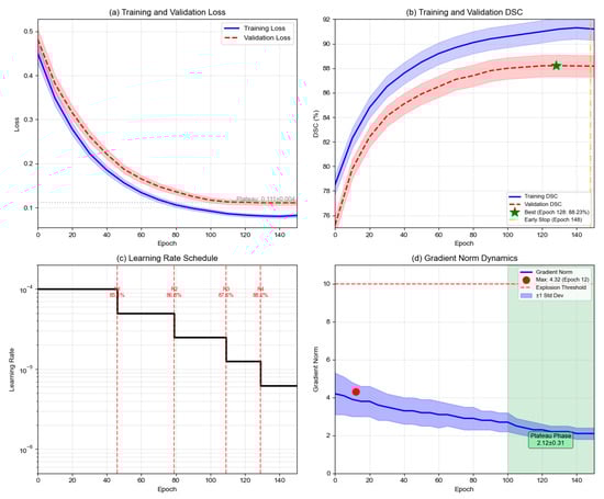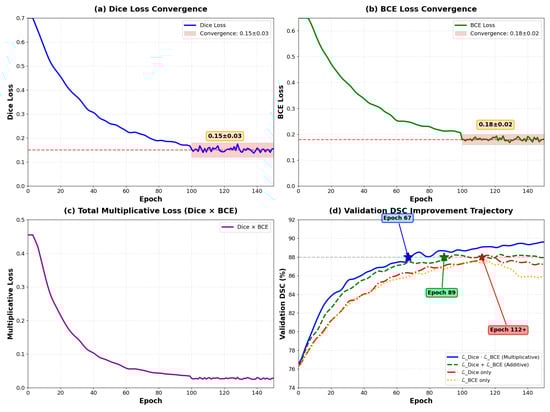 As illustrated in Figure 4, the training dynamics reveal several critical characteristics. Both Dice loss and BCE loss components converge to stable values (Dice Loss: 0.15 ± 0.03, BCE Loss: 0.18 ± 0.02) after approximately 80 epochs. Importantly, neither component approaches zero, thereby avoiding gradient vanishing issues commonly encountered in multiplicative formulations. This stability is ensured through the smoothing parameter ε = 1 × 10−7 in Equation (16), which prevents numerical instability. The multiplicative loss (Dice × BCE) demonstrates smooth convergence from 0.48 to approximately 0.03, while validation DSC metrics show consistent improvement across different loss configurations.