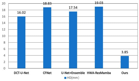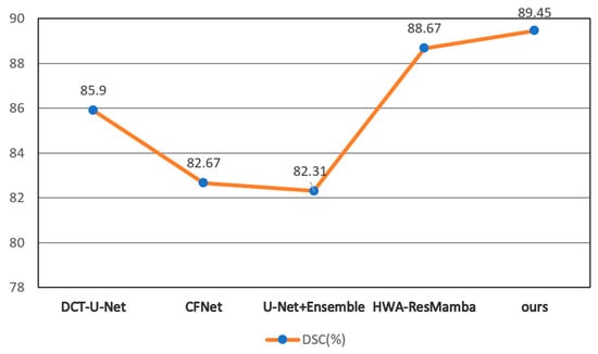 The multiplicatively coupled Dice-BCE loss function provides incremental yet significant refinements, improving DSC by 1.56% and reducing HD by 15.6% (4.56 mm → 3.85 mm). The multiplicative coupling creates adaptive gradient effects: BCE gradients dominate when boundaries are blurred, while Dice gradients dominate when structures are fragmented. This synergistic mechanism, expressed in Equation (18), simultaneously optimizes regional connectivity and boundary sharpness.