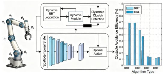 The advancement of Industry 5.0 has raised higher demands on the dynamic obstacle avoidance capabilities of robotic arms in flexible manufacturing and intelligent logistics scenarios [1,2,3]. In dynamic environments, robotic arms need to avoid unstructured obstacles such as mobile equipment and operating personnel in real time, posing severe challenges to traditional path planning methods [4,5,6]. Although the sampling-based RRT algorithm performs stably in static environments, its high computational complexity for global path reconstruction makes it difficult to adapt to real-time changes in dynamic obstacles [7,8,9]. Deep reinforcement learning demonstrates environmental adaptability through end-to-end strategy learning [10], but its low sample efficiency and insufficient physical feasibility limit its industrial applications [11]. Studies have shown that when the speed of dynamic obstacles exceeds 2 m/s, the success rate of obstacle avoidance using traditional methods drops below 72% [12,13,14], and the stringent real-time requirements of industrial scenarios further exacerbate the technical challenges [15,16].