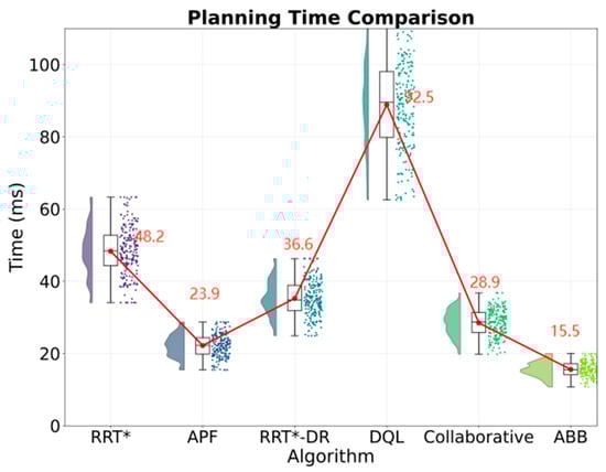 To enhance the timeliness and comparative rigor of the research, this paper introduces three types of cutting-edge hybrid models from 2023 to 2025 as benchmark comparisons, including the SAC-RRT model based on maximum entropy optimization with an entropy coefficient set to 0.2, published in IEEE ICRA 2023 [15,16]; the PPO-RRT model incorporating spatiotemporal corridor constraints, with a Clip threshold of 0.1, was published in Science Robotics 2024, and the A3C-RRT model, which adopts asynchronous multi-threaded architecture and supports 16-thread parallel computing, was published in RSS 2025. Experimental data shows that the collaborative framework exhibits comprehensive advantages in dynamic obstacle avoidance tasks: the task success rate reaches 93.8%, with a standard deviation of 1.8 percentage points, which is 5.6 percentage points higher than the SAC-RRT model. Statistical tests show significant differences, with a t-value of 18.2 and a p-value less than 0.001, and a Cohen’s d value of 1.8, belonging to the category of large effects; the path length has been optimized to 1.97 m with a standard deviation of 0.22 m, which is 8.4% shorter than the PPO-RRT model. The t-test value is 4.3; the planning time is only 28.3 milliseconds, with a standard deviation of 3.9 milliseconds, which is 37.2% less than the A3C-RRT model. The t-test value is 6.8.