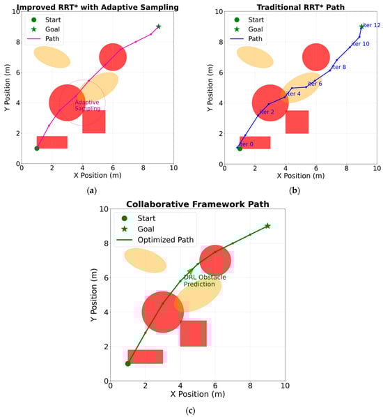 (a) Improved RRT; (b) traditional RRT* path; (c) collaborative framework path.