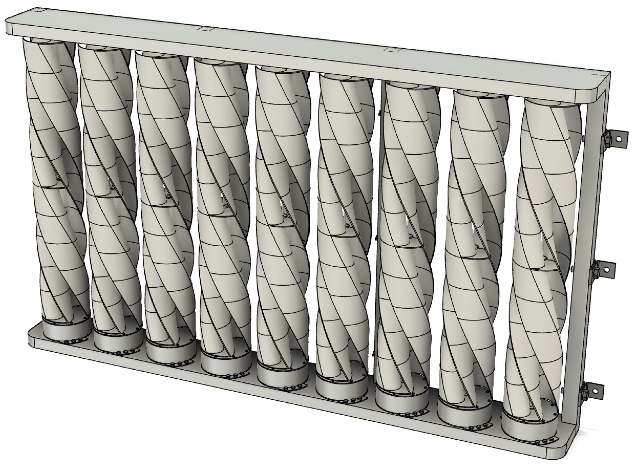 Building upon these advantages of VAWTs, a design is proposed in this paper to maximize their performance and adaptability. This concept is the “Wind Wall,” which utilizes multiple vertical-axis turbines which are arranged in a series formation and put together in a compact frame to optimize energy capture. Unlike traditional stand-alone turbines, this configuration allows multiple VAWTs to work collectively, enhancing efficiency while minimizing land usage [