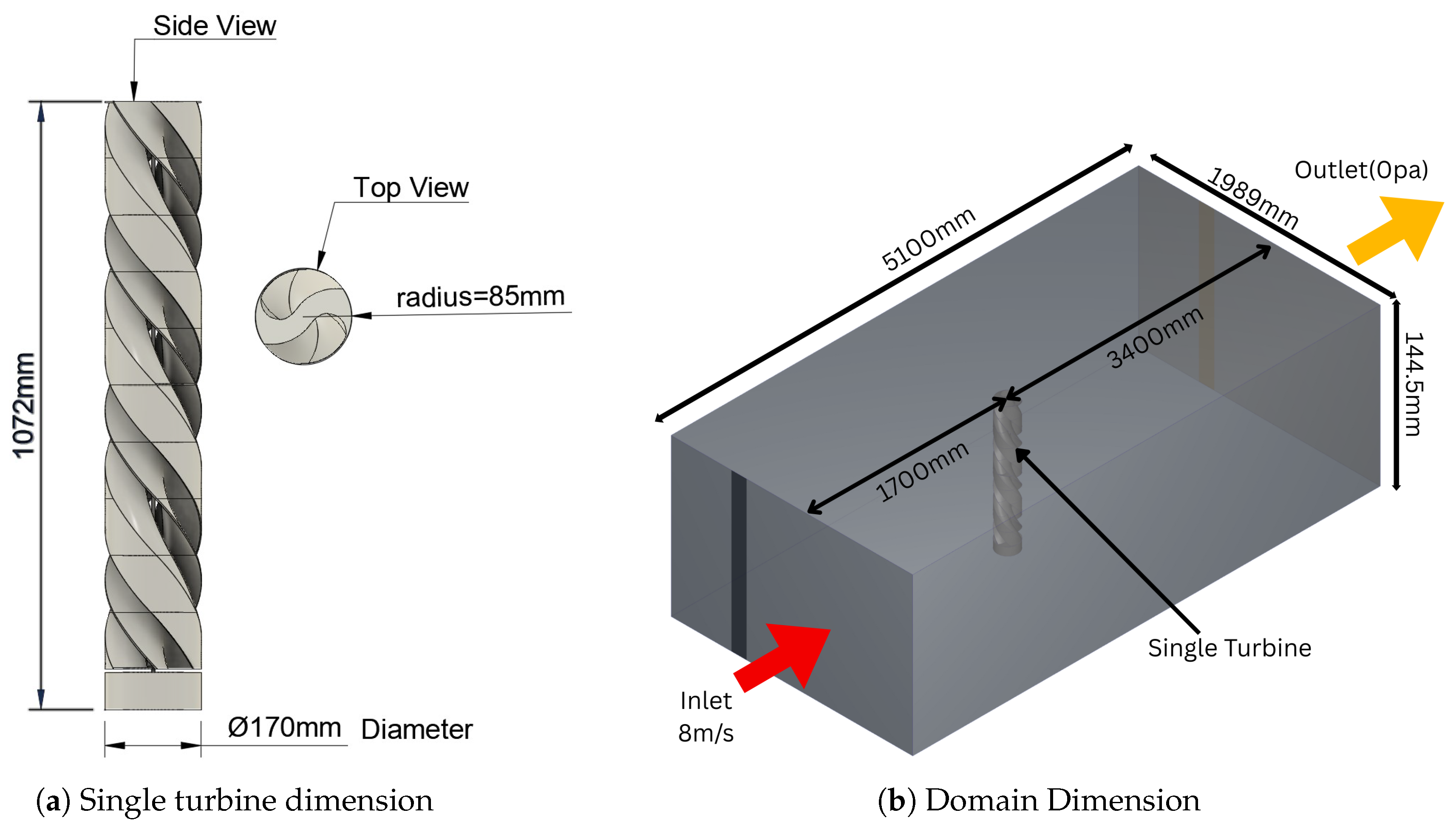 For the single-turbine simulations, which were conducted to identify the optimal helix angle, the computational domain was defined as follows (with turbine diameter ):
