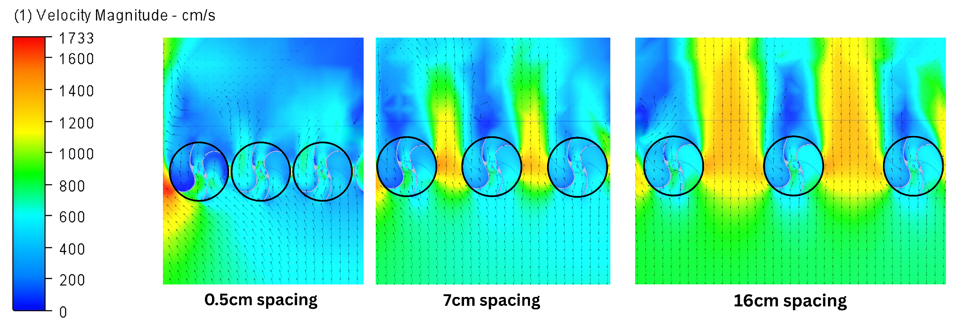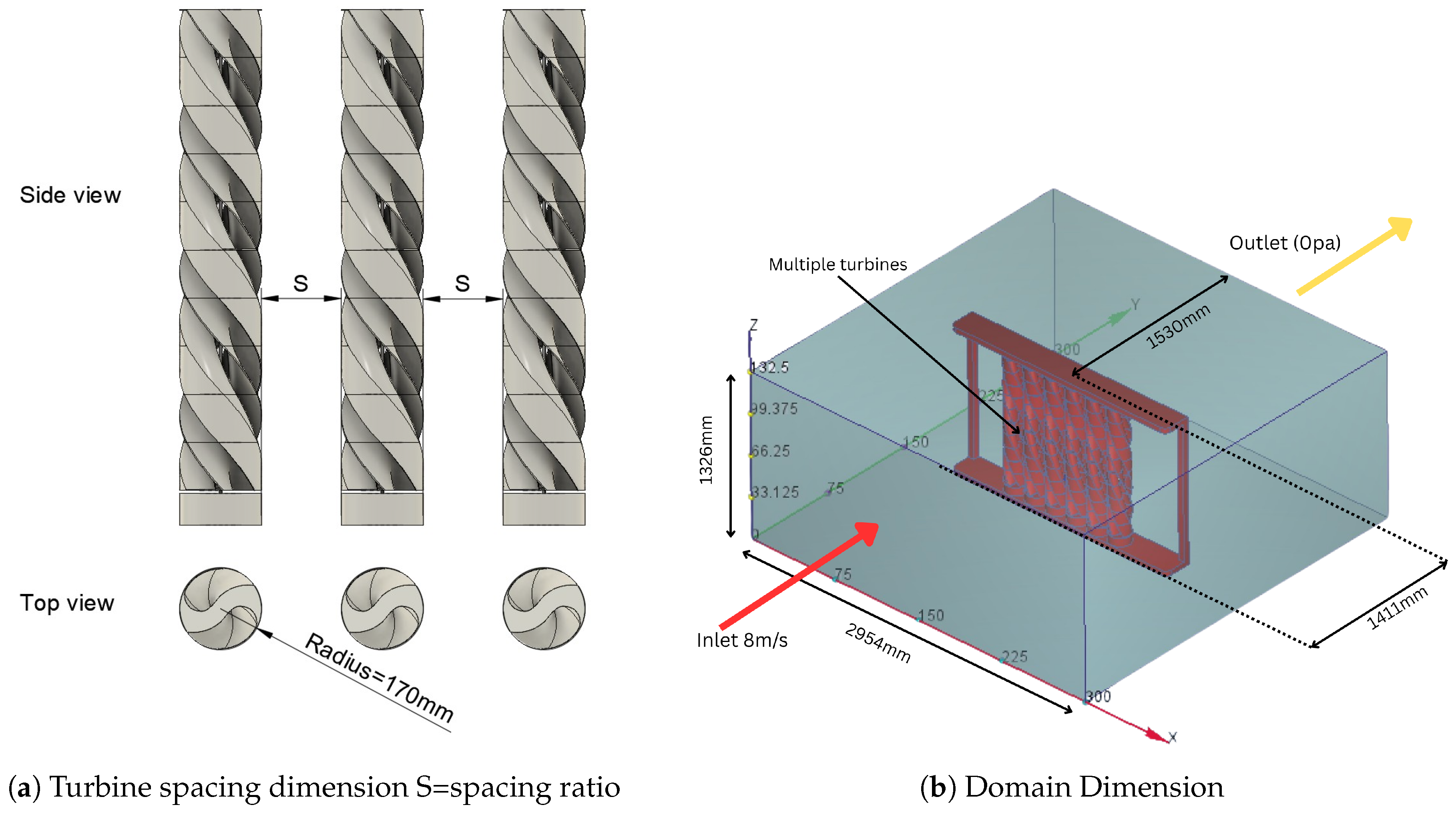 40]. The spacing between turbines were varied as 0 cm, 0.5 cm, 1.66 cm, 4 cm, 7 cm, 11 cm, and 16 cm. These values were selected to cover both closely spaced and widely separated configurations, allowing the effect of turbine interaction to be captured effectively.
