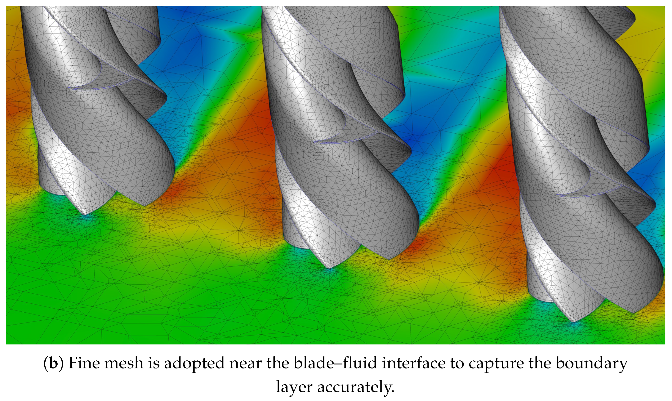Table 2, all lateral tunnel walls that were perpendicular to the inlet–outlet direction (top, bottom, and side walls) were modeled as slip surfaces so that boundary layer formation on those walls was suppressed and artificial wall effects were minimized. The front (inlet) and back (outlet) faces of the tunnel were prescribed as the velocity inlet and the pressure outlet, respectively. The rotor surfaces were treated as non-slip ABS solid surfaces, with the appropriate material properties being assigned for force/torque extraction.
