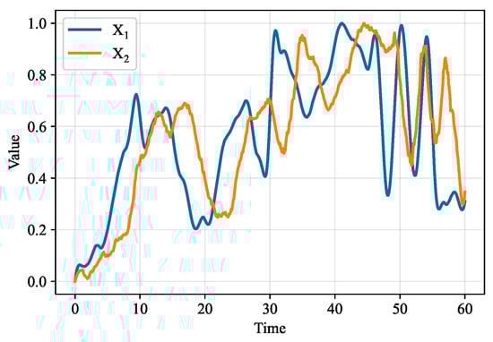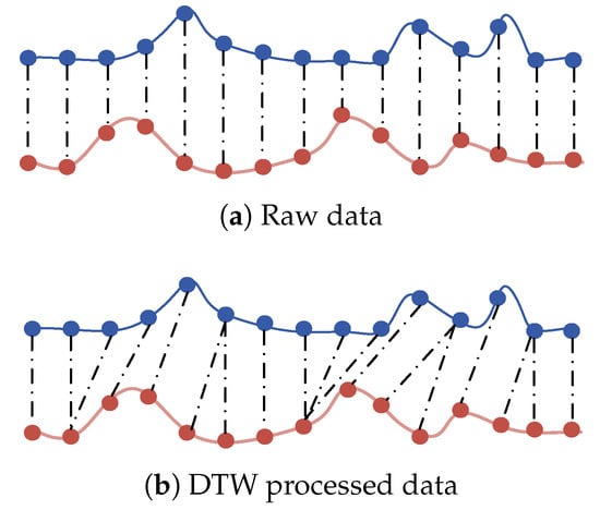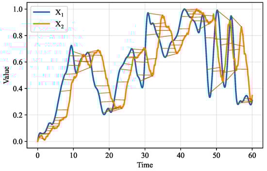 Taking – as an example, we take the DTW time window as 50 time steps and the mutual information threshold as 0.05. The processing of DTW is shown in Figure 7, Figure 8 and Figure 9.
