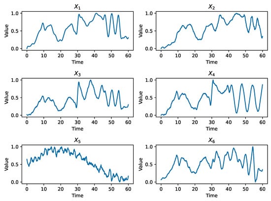 From the data in Figure 7, it can be seen that and have a causal relationship, where changes after with a certain delay. Comparing Table 1 and Table 2, the correlation coefficient between and in Table 2 is significantly higher than in Table 1, showing that DTW processing can enhance truly causal variable pairs for better causal inference. After DTW processing, variable pairs , , , , , and were selected for information gain approximation.