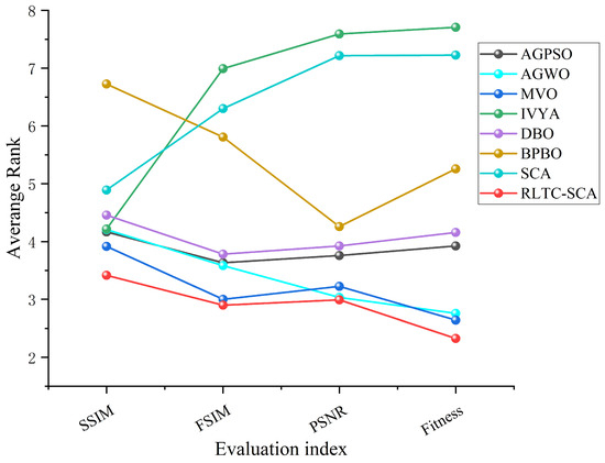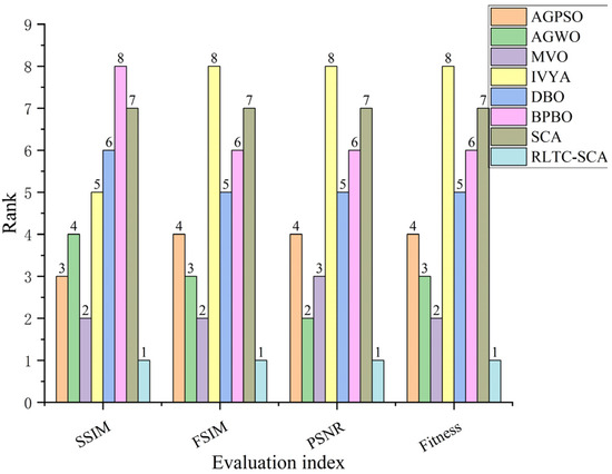 Figure 9 and Figure 10 visualize the average and final rankings, transforming the quantitative data in Table 9, Table 10, Table 11 and Table 12 into an intuitive global comparison, further confirming RLTC-SCA’s comprehensive advantages. Figure 9 shows the average rankings across the four metrics (Otsu fitness, PSNR, FSIM, SSIM), with RLTC-SCA consistently ranked 1st. For PSNR, the average ranking is 2.99, far ahead of IVYA (7.59) and standard SCA (7.22). For FSIM, the average ranking is 2.90, slightly better than second-ranked MVO (3.00), demonstrating balanced performance across multiple evaluation metrics. In contrast, AGPSO ranks 4th in Otsu fitness but drops to 5th in PSNR and FSIM, showing difficulty in balancing threshold accuracy and segmentation quality. Figure 10 further highlights RLTC-SCA’s absolute superiority, with stable 1st-place rankings across all metrics, exceeding the 2nd-place algorithms by more than one ranking unit, while standard SCA and IVYA perform poorly due to limited local search and imbalance between global exploration and local exploitation.