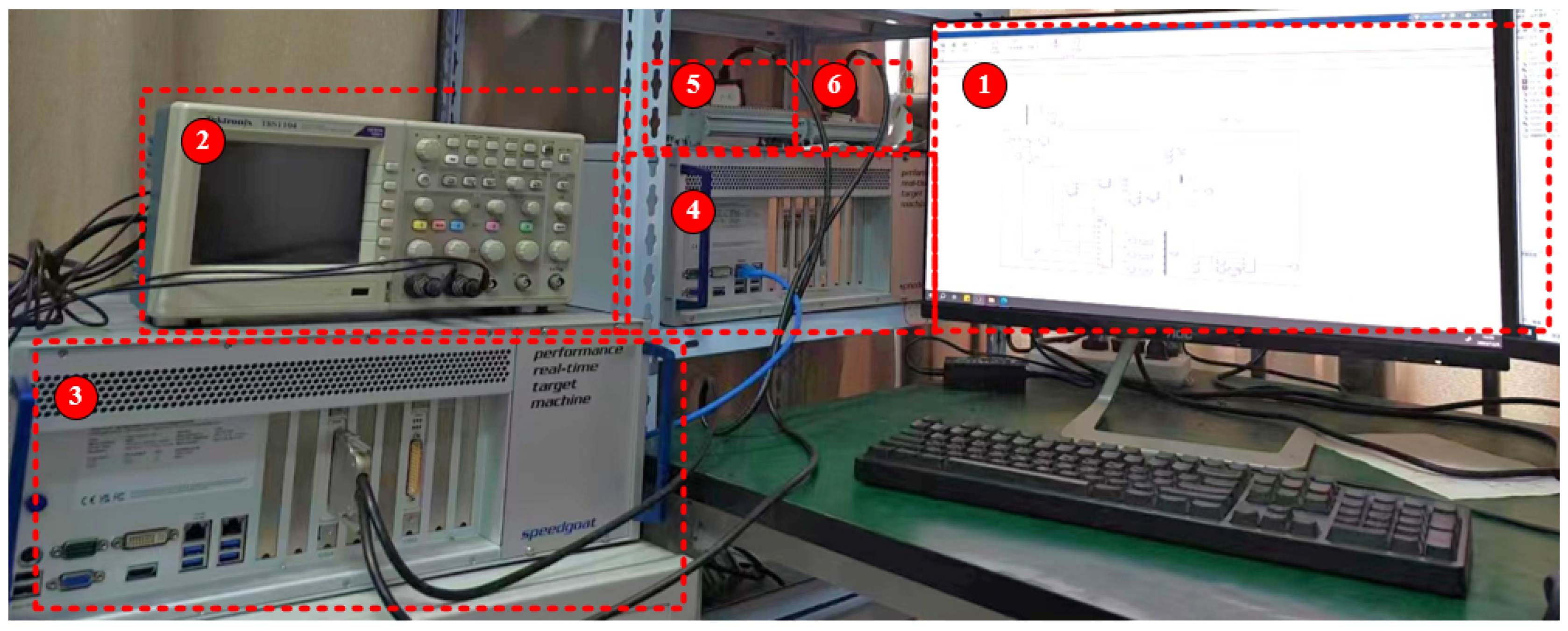 Figure 11. (1) is the mainframe, (2) is an oscilloscope that allows real-time observation of the output waveforms, (3) is the Speedgoat (1) simulator, which performs real-time simulation of the circuit, and (4) is the Speedgoat (2) simulator, which is the controller that runs the model in the internal FPGA control algorithms in the CPU environment and through the analog and digital of the (5) and (6) boards.