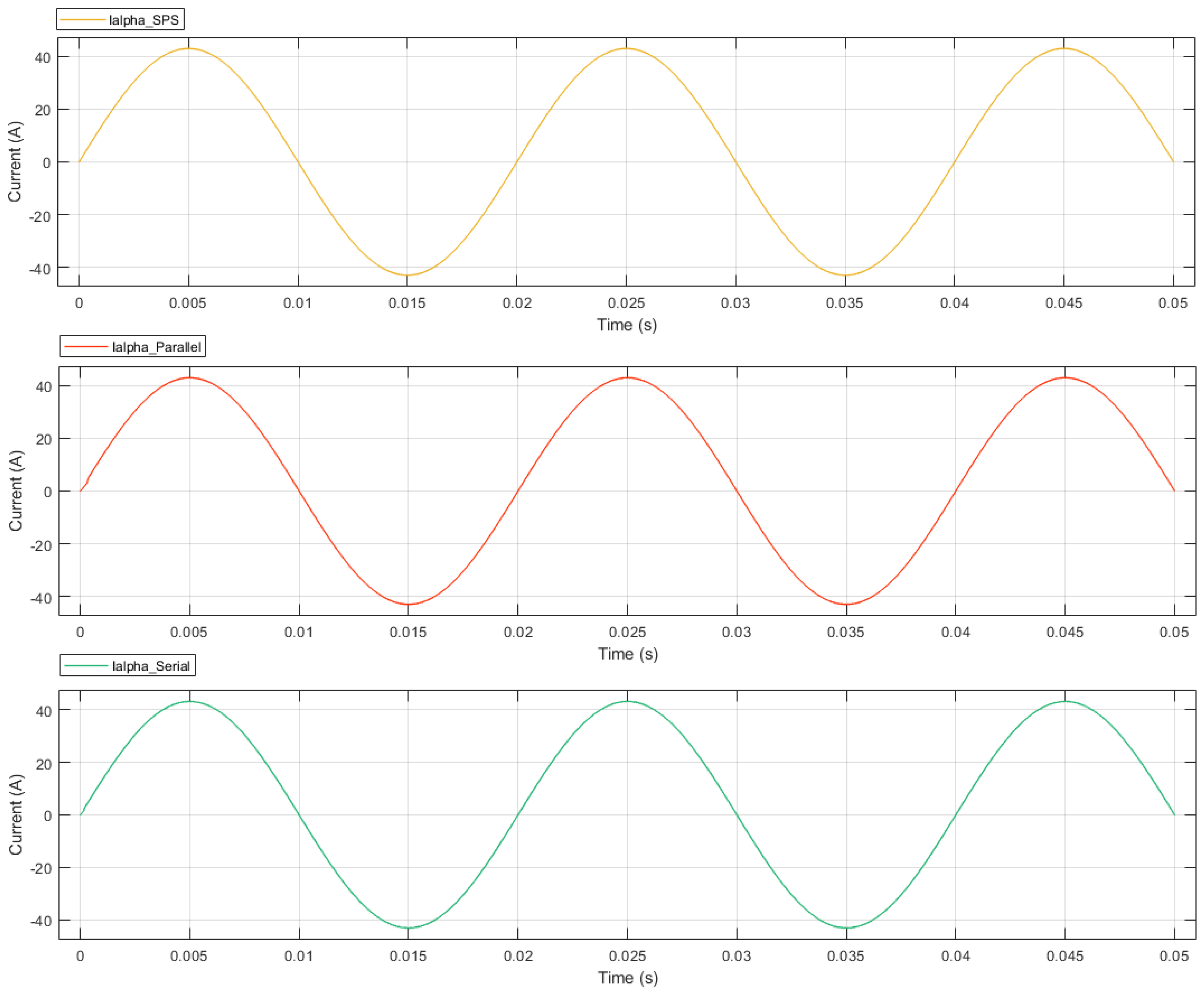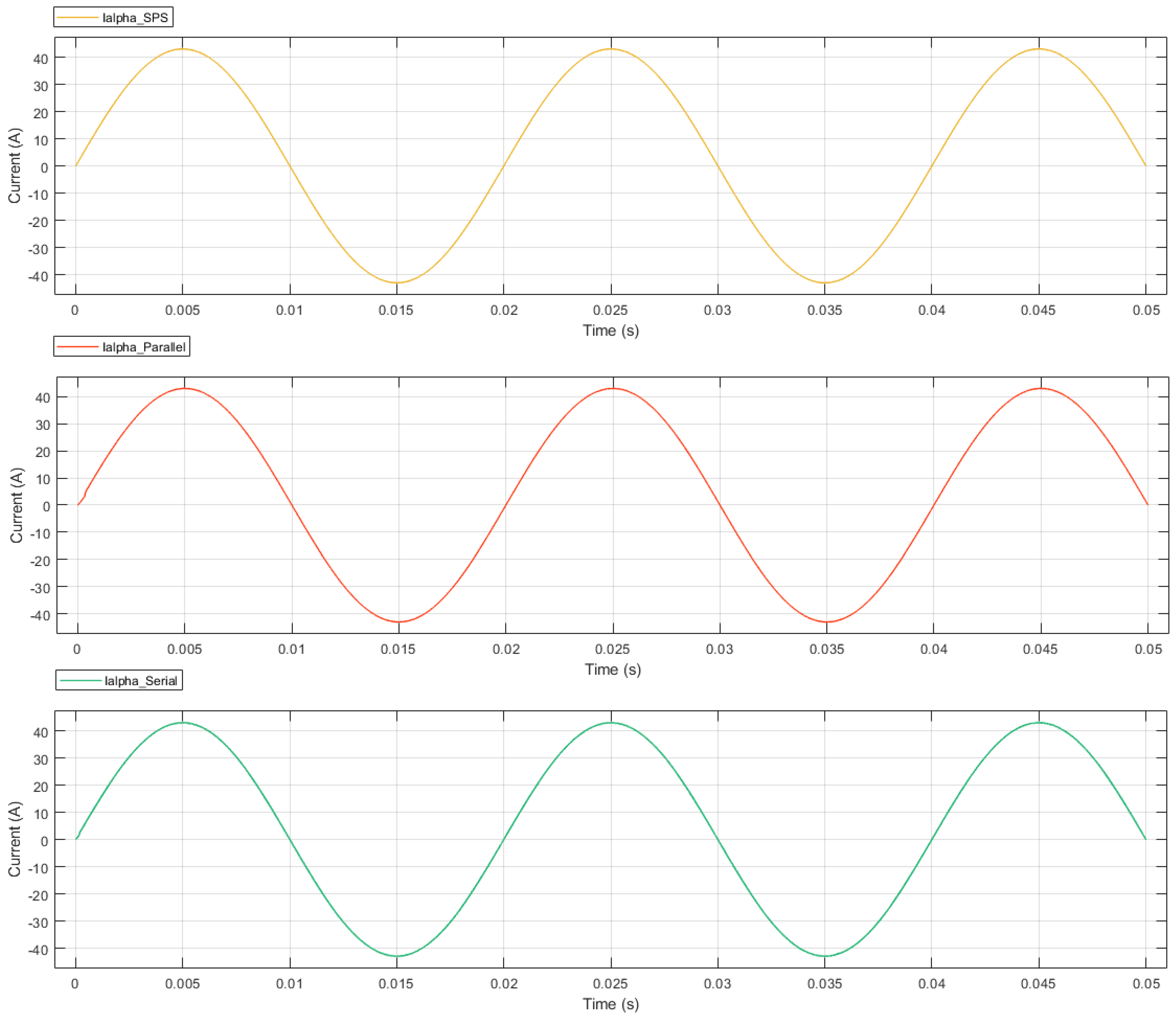 In this section, we delve into and compare the real-time results of the hardware-in-the-loop simulation. The design of this experiment includes a comparison between parallel decoupling and serial decoupling, as well as a performance comparison with SPS. In order to verify the accuracy of the modeling, we first simulated the model on the FPGA board using the parallel decoupling and serial decoupling methods, both of which use the same simulation parameters as the SPS, as shown in