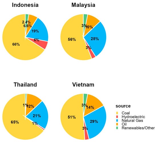 Electricity generation mix in selected Southeast Asian countries (Indonesia, Malaysia, Thailand, and Vietnam). Source: BP Statistical Review of World Energy (2023).
