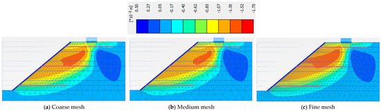 Vertical displacement distribution at phase 5 of soil slope with different mesh densities.