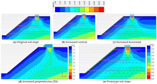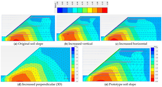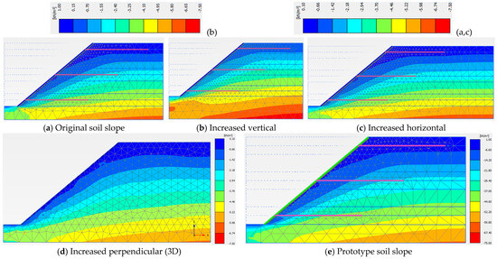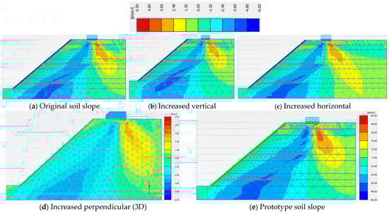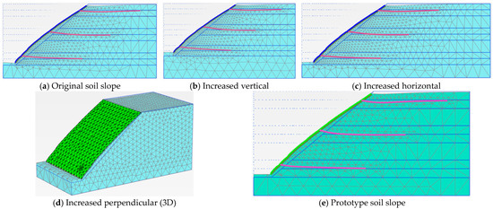 A Perspex box of 176 cm × 85 cm × 100 cm was selected as the experimental setup for the reinforced soil slope, based on simulation criteria for material properties and geometric dimensions, and the same dimensions are adopted for the development of the finite element models to investigate the model dimension sensitivity. The prototype soil slope was simulated using a scale factor of ten [17]. The facing materials should be adaptable to accommodate ground movement during excavation. Therefore, a Perspex plate with a thickness of 0.5 cm is selected to simulate the Shotcrete in the prototype reinforcing system of thickness 14 cm. The nails used in this study are circular cross-section steel rods 70 cm in length. The diameter of the model nails is 0.5 cm to simulate the actual nail of diameter 5 cm. A rigid steel plate of dimensions 84 cm × 15 cm × 2.2 cm thick is used to act as a building footing to exert a distributed load on the soil mass. The effect on the predicted performance of nailed soil slopes, assessed using finite element modeling by varying the model dimensions, specifically vertical, horizontal, and perpendicular (3D) scaling, is investigated. Comparisons are drawn between the original laboratory-scale model, dimensionally adjusted versions, and a full-scale prototype model. Figure 10 shows the initial mesh configurations for the five models, namely the original soil slope (reference laboratory dimensions), increased vertical and increased horizontal dimensions to test aspect ratio effects, increased perpendicular (3D) to approximate out-of-plane influence, and a prototype model, representing the full-scale geometry. The soil mass in the 3D model is modeled using 10-node tetrahedral elements, and 6-node triangular elements are used to model plate (facing and footing) elements. All models maintain a consistent mesh quality and reinforcement layout to isolate the effect of geometric scaling (Figure 10). The deformed mesh at construction phase 5 and loading phase 8 of nailed soil slope development is depicted in Figure 11 and Figure 12.