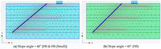 Initial discretization of soil slope finite element models with different slope angles and material models.
