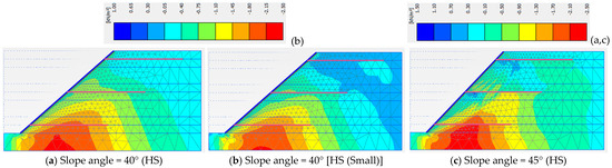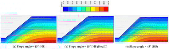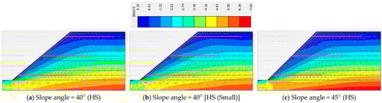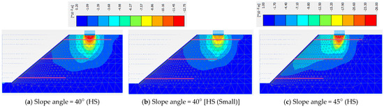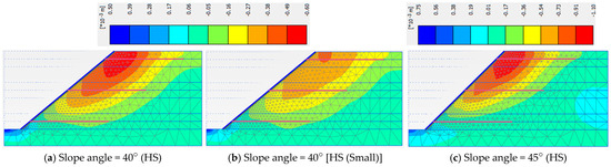 The performance of the finite element models for nailed soil slopes when varying slope angles and constitutive soil models is presented in Figure 24, Figure 25, Figure 26, Figure 27, Figure 28, Figure 29, Figure 30, Figure 31, Figure 32, Figure 33, Figure 34 and Figure 35 and in Table 9, detailing mesh deformations, displacements and stress distributions, and factors of safety. From the figures of the construction and loading phases of nailed soil slope development, it can be seen that there is lower deformation in the 40° slope models compared to the 45° slope, indicating improved stability at flatter angles. The HS (small) model results in slightly reduced deformation compared to HS material model, confirming the impact of capturing small-strain stiffness for a realistic short-term response. The 45° slope exhibits more pronounced lateral bulging and toe movement in both the HS and HS (small) models, consistent with expected instability trends for steeper slopes. The horizontal displacement distribution shown in the figure confirms that displacement magnitudes increase with slope steepness. The soil slope with angle 40° with the HS (small) material model yields the least deformation, followed by angle 40° with the HS material model, and then the soil slope with angle 45°. At the latter loading phases, the horizontal displacements become significantly more extensive, suggesting that the construction sequence critically influences the slope behavior. The figures for vertical displacement reveal a similar trend, confirming that this progression equally affects vertical displacements. Settlements are most prominent under the footing and along the slope crest. The HS (small) material model provides improved resistance to vertical deformation compared to HS at the same slope angle. The 45° slopes demonstrate larger settlements, aligning with theoretical expectations of lower stability on steeper slopes. The stress distribution during the construction and loading phase for different slope angles and material models indicates that HS (small) material models exhibit lower horizontal stress magnitudes. This suggests better soil confinement and reduced active earth pressure. On the 45° slopes, horizontal stresses concentrate near the nail head, indicating potential development of slip surfaces. Vertical stress patterns show stress arching around reinforcements and localized zones of compression behind the nails. HS (small) distributes vertical stresses more uniformly, especially under shallow overburden. The shear stress distribution is critical for the slope failure potential. Higher shear stress concentrations appear at the toe in the 45° models. HS (small) shows less intense peak shear zones, possibly delaying the onset of plastic failure. Shear zones deepen and broaden during loading phases, demonstrating the accumulation of stress from sequential excavation and loading. Stability studies clearly show the influence of the slope development, slope angle, and material model effect on factors of safety (FOSs). The 45° slope consistently yields the lowest FOS, indicating higher susceptibility to failure. The HS (small) material model shows marginal FOS improvements over the standard HS material model, particularly during loading phases, which is attributed to more realistic simulation of soil stiffness at small strains. FOS values peak at an intermediate development phase before they decline, reflecting the maximum stability mid-construction followed by a reduction due to a subsequent loading increment or deeper excavation.
