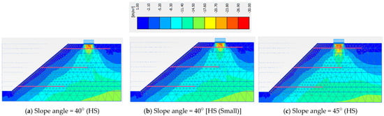 Vertical displacement distribution for different slope angles and material models at construction phase 5.