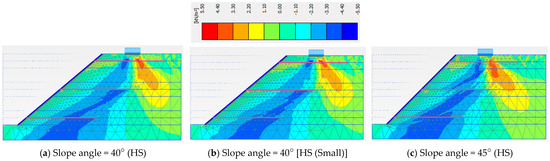 Horizontal displacement distribution for different slope angles and material models at loading phase 8.
