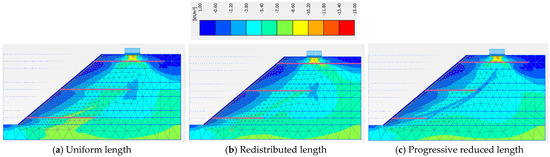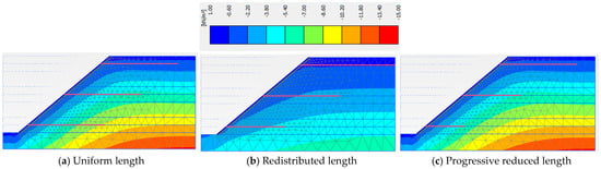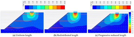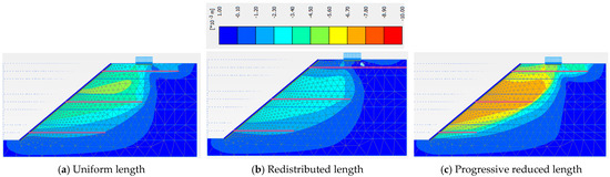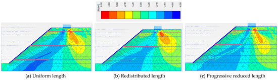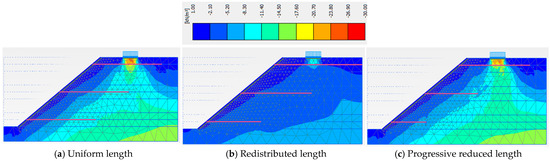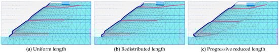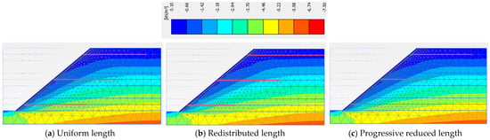 As noted by Saran [29], effective nail design requires extension beyond the anticipated rupture surface to mobilize reinforcement and resist tensile forces within the failure wedge, and according to Bahramipour et al. [24], increasing the nail length greatly increases stability, but the benefits reduce beyond a threshold length. The impact of three nail length configurations—equal length (all nails have a uniform length across the slope height), redistributed length (lengths vary but are optimized per layer to maximize efficiency, e.g., longer nails at critical depth, at top), and progressively reduced length (lengths decrease progressively from bottom to top, same length in top layer with three-quarters, and half in middle and bottom layers)—are evaluated for a soil-nailed slope based on slope stability, displacement, and stress behavior. The performance is assessed at different construction and loading phases. Soil slope finite element models’ discretization for various nail length distribution strategies in slope layers is portrayed in Figure 36. Figure 37 and Figure 38 illustrate deformed meshes at phase 5 (construction) and phase 8 (loading) for various nail length distribution strategies.