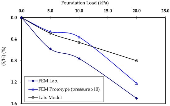 Footing settlements at different footing pressures in laboratory physical model and finite element model of nailed soil slope.