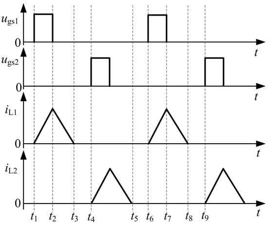 Under steady-state conditions, one switching period is partitioned into six phases, as illustrated in Figure 2. According to the aforementioned content, the main waveforms under CCM of the current are shown in Figure 3. Obviously, the state of the current operates in the CCM under the magnetic coupling interval that occurs, as shown in Figure 3. And at the same time, it is ensured that currents and must work in DCM in any case, where , , , and are the driving signals of MOSFETs and , the switching period, and the conducting time. During the time intervals (), the magnetic coupling interval of the currents and will appear.