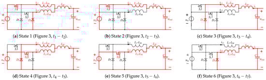 Equivalent circuits corresponding to the six operating modes of the proposed converter: (a) State 1; (b) State 2; (c) State 3; (d) State 4; (e) State 5; and (f) State 6.