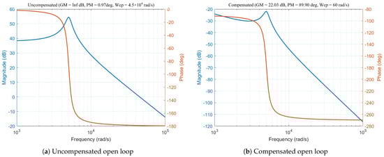 As indicated by Figure 8a, the open-loop magnitude response has a shallow slope in the low-frequency range, which leads to a sluggish dynamic response. The phase margin is , so the system has poor robustness and weak damping. A PI compensator is designed to stabilize the system and enhance its dynamics. The compensated transfer function is defined in Figure 8b, and the corresponding Bode diagram is constructed from it.