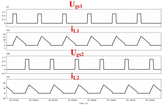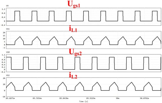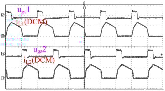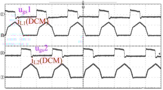 Experiments are performed to confirm the validity of the theoretical analysis and to corroborate the obtained simulation outcomes. From Figure 14 and Figure 15, the relationship of the two interleaved driving signals ( and ) and the self-inductance currents ( and ) are the same as those of Figure 9 and Figure 10.