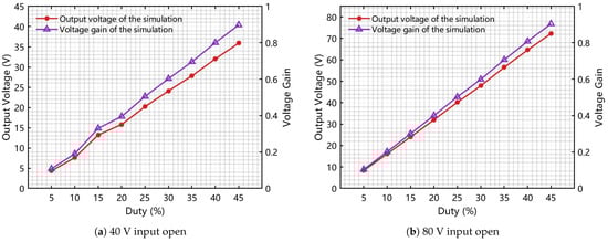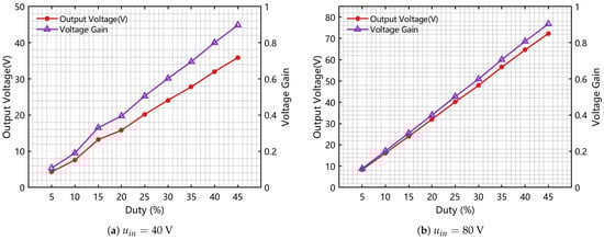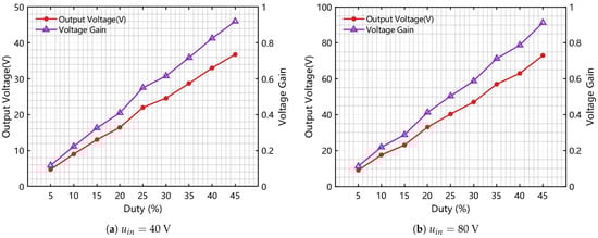 The load resistance is kept at a fixed value of 10 ohms, and the voltage applied to the energy-input port is configured to 40/80 V. The control switch’s duty ratio is adjusted within the range [0.05, 0.45] with a fixed step increment of 0.05. Through open-loop scanning, the curves depicting actual conversion gain and output voltage with respect to switching duty-cycle changes are derived, and the corresponding results are shown in Figure 16a,b.