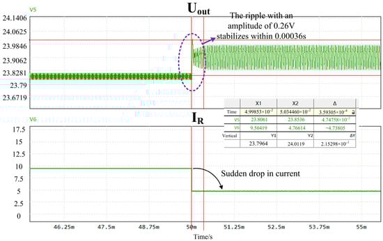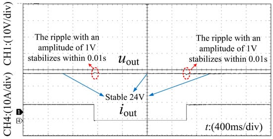 The simulation framework incorporates closed-loop control, with the controller’s effectiveness verified under an abrupt load change scenario. With the input voltage fixed at and the load stepped from to , the output voltage exhibits only a deviation and returns to steady state within approximately . Compared to the steady output of 24 V, the voltage fluctuation is only of the steady-state value. Figure 12a indicates that a load step from to at a constant 80 V input causes only a 1 V output fluctuation, with settling achieved in s. Compared to a stable output 24 V, voltage fluctuation is only of the steady-state value. The closed-loop simulation results are depicted in Figure 12b. As shown in Figure 12a,b, the controller attains the preset setpoints under both dynamic input–voltage variations and abrupt load changes.