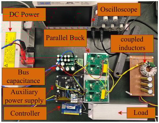 To verify the feasibility of the proposed high-gain coupled-inductor converter, a hardware prototype was fabricated using the component values summarized in Table 2. The corresponding experimental setup is illustrated in Figure 13. The control platform is implemented using an STM32F103ZET6 development board as the core controller. The MOSFET is driven by a half-bridge gate-driver circuit to generate the required control pulses. The load stage is formed by the resistor XLGR. The output-voltage node is routed through a parallel voltage sensor board to the STM32 ADC channel, thus closing the feedback control loop.