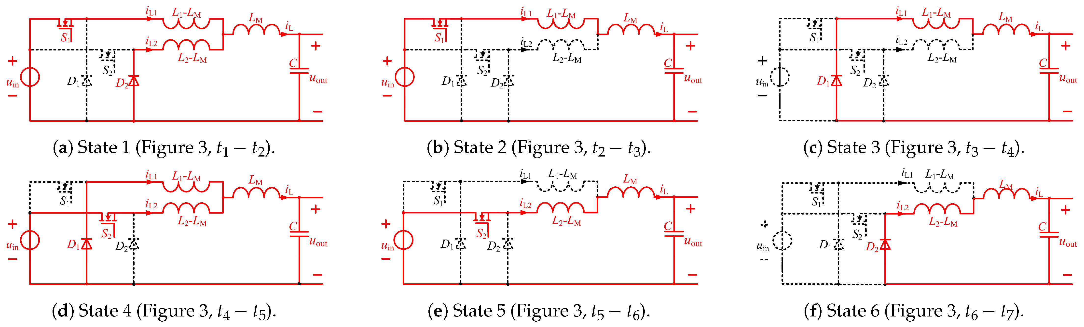 The converter operates through a multi-stage energy-exchange process over each switching period. During each cycle, the inductor current exhibits a periodic piecewise-linear waveform. Within each cycle, it initially maintains zero current, then rapidly rises, linearly rises to a peak, and rapidly falls back to zero current. The overall waveform resembles a cyclical “pulsed triangle wave”, exhibiting distinct piecewise-linear characteristics. The preparation of ZCS is performed by coupled inductance and diode renewal. The phases of the inductor currents and differ, demonstrating a periodic pattern of alternating operation. According to a previous analysis, MOSFETs and freewheeling diodes are found to operate in ZCS.