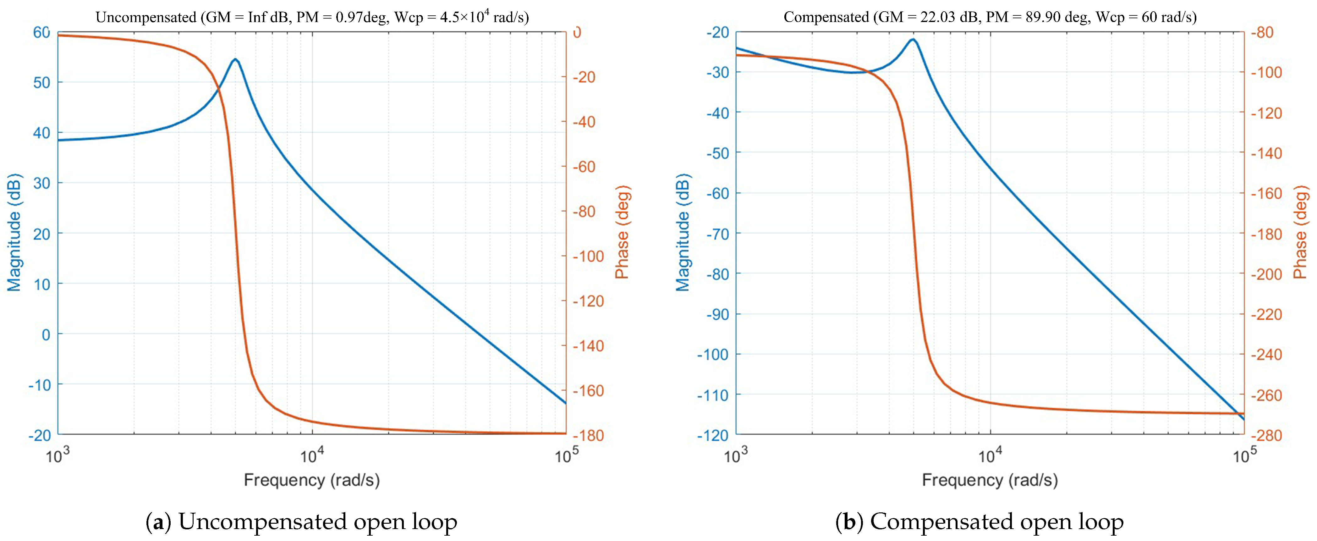 Figure 8a, the open-loop magnitude response has a shallow slope in the low-frequency range, which leads to a sluggish dynamic response. The phase margin is
