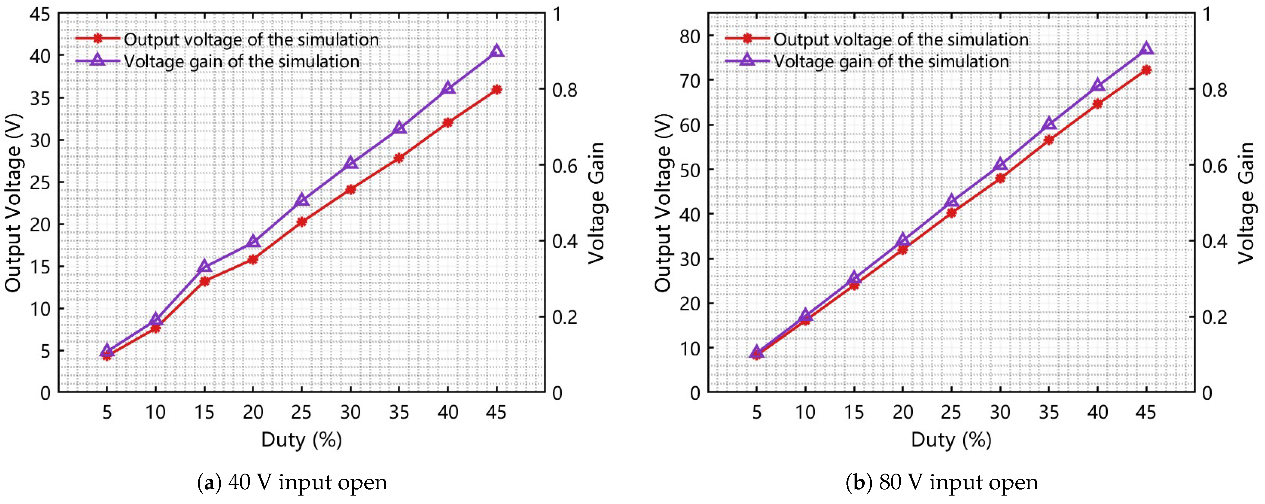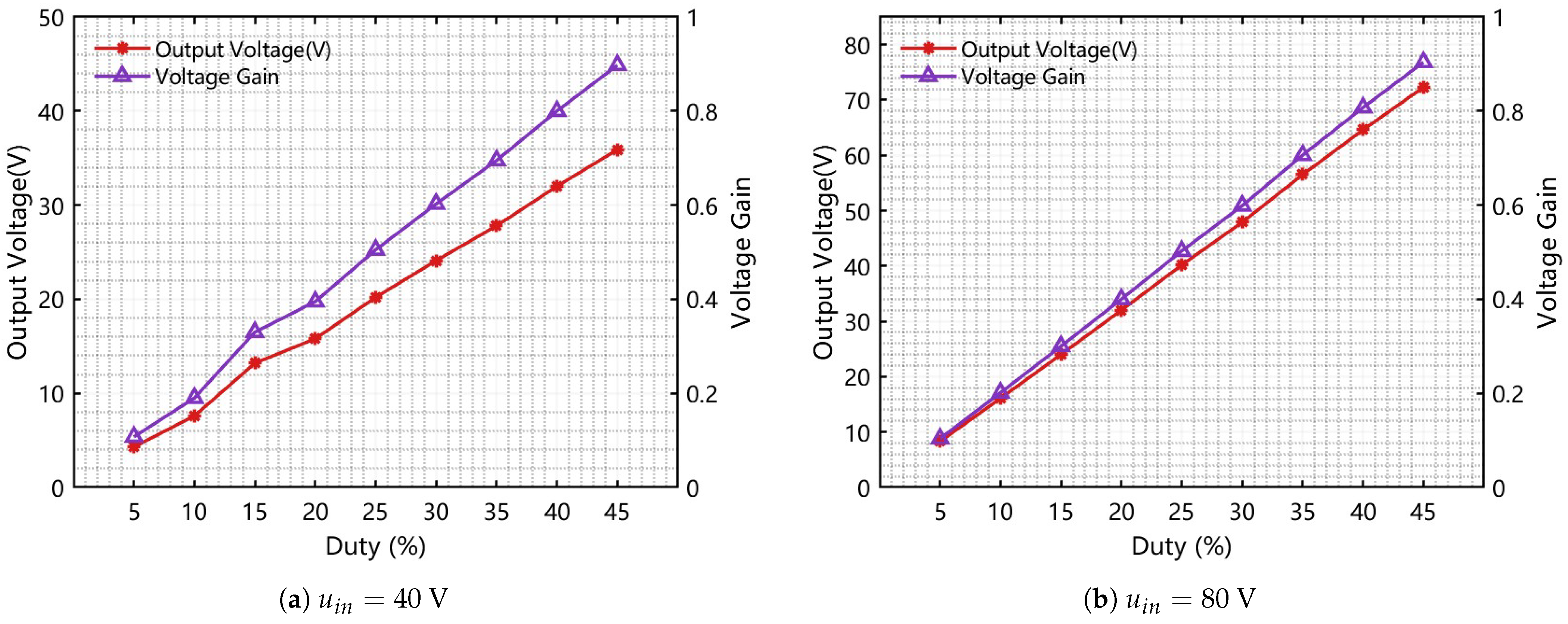 For the considered DC–DC converter, the voltage conversion gain exhibits a linear dependence on the duty cycle