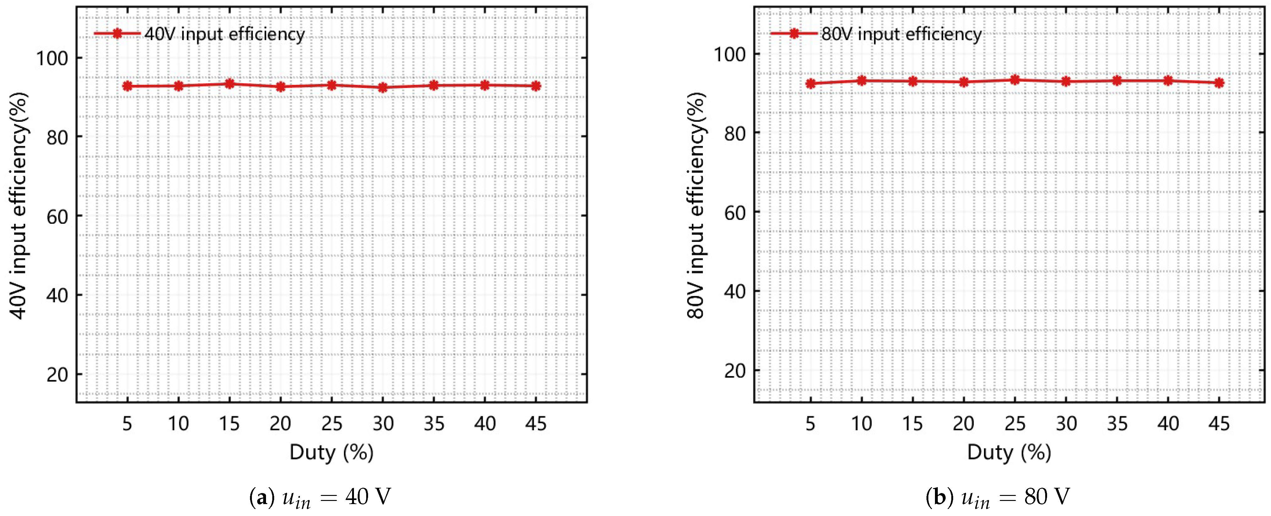 Experimental waveforms confirm that the main power devices can achieve zero-current (and near zero-voltage) switching over the intended operating range, which effectively reduces switching losses. Because of the proposed current-shaping mechanism and positively coupled structure, the effective duty cycle range is extended, and a higher voltage conversion ratio is obtained compared with a conventional interleaved Buck converter at similar duty cycles. The prototype achieves a maximum efficiency of 93.3% with a conversion ratio of 0.5, demonstrating that the proposed topology can simultaneously realize high efficiency and a high conversion ratio with a relatively simple hardware implementation and control scheme.