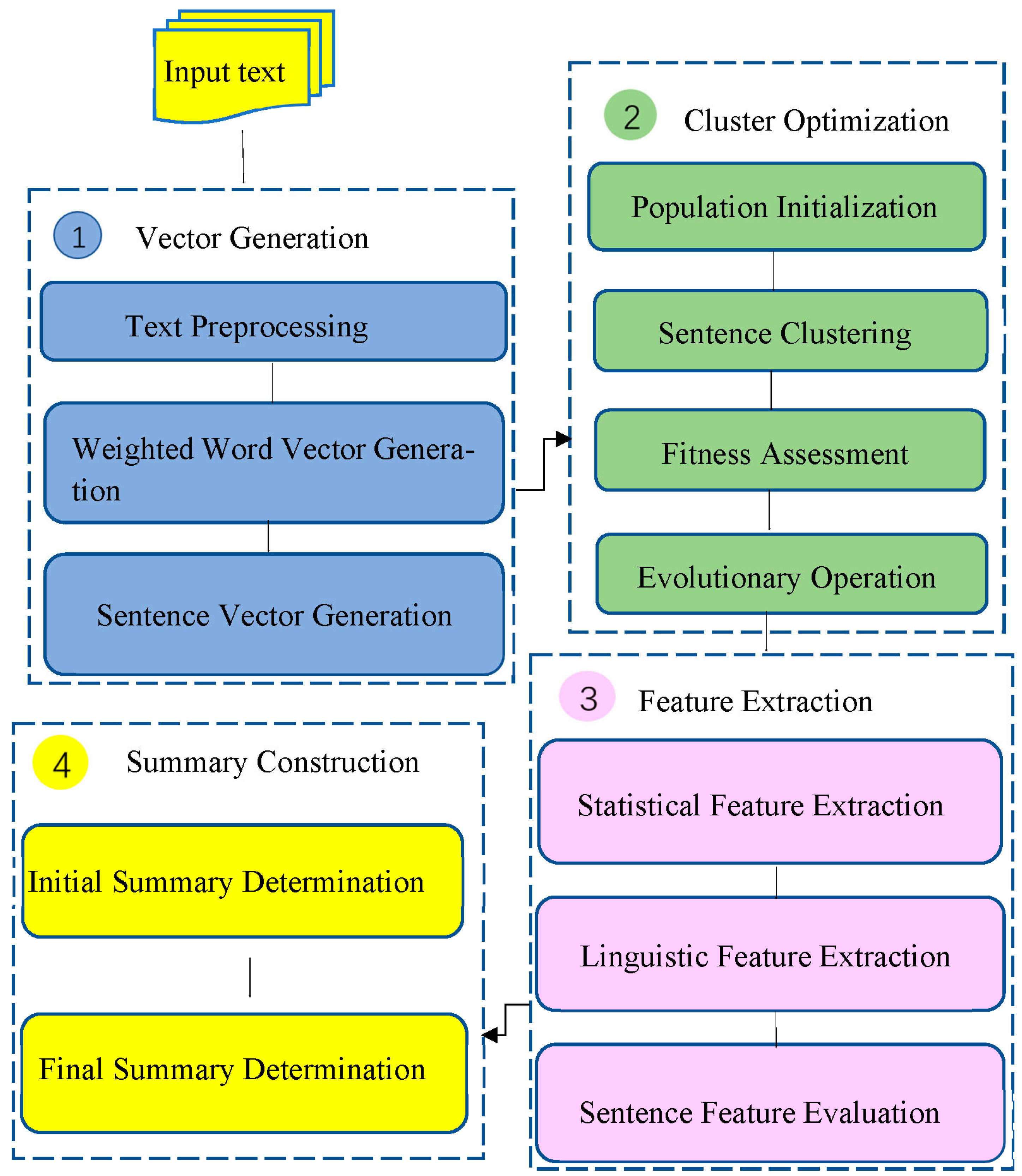 Figure 1 shows the architecture of our model. Precisely, our proposed approach is divided into four modules: vector generation, cluster optimization, feature extraction, and summary construction. The vector generation module involves obtaining the weighted word vector using the TF-IDF and Word2Vec model and generating the representation vector of sentences. The cluster optimization module uses the Genetic Algorithm with symmetry to optimize the K value to improve the silhouette coefficient of the sentence-clustering results, and, finally, obtain the optimal sentence-clustering effect. The feature extraction module involves extracting the sentence features from the text, with the sentence features including statistical features and linguistic features, and using these features to calculate the feature scores of the sentences. The summary construction module involves selecting the sentences with higher feature scores from the clusters, using the Maximal-Marginal-Relevance algorithm to calculate the MMR values of these sentences, and selecting the sentences with higher MMR values to form the final text summary.