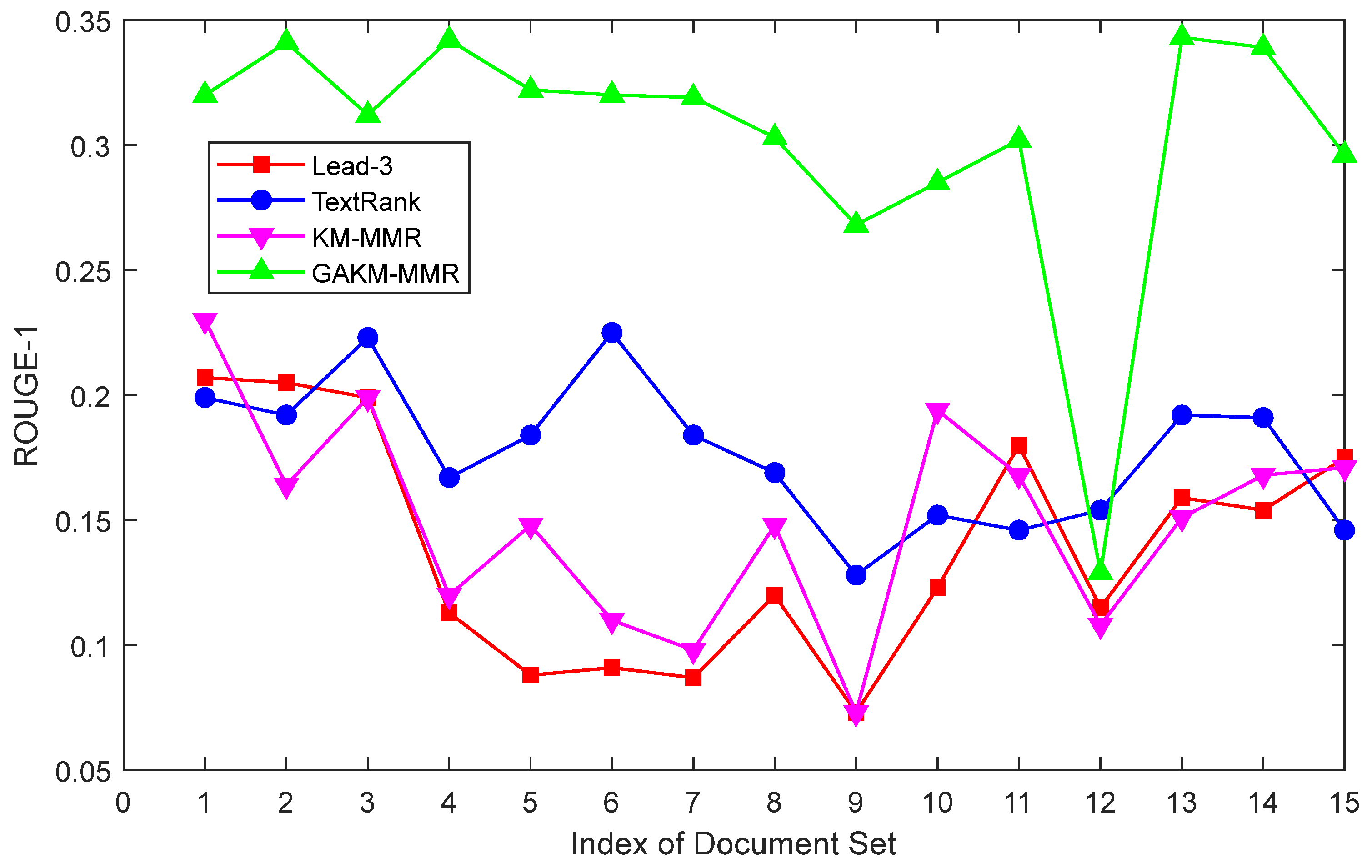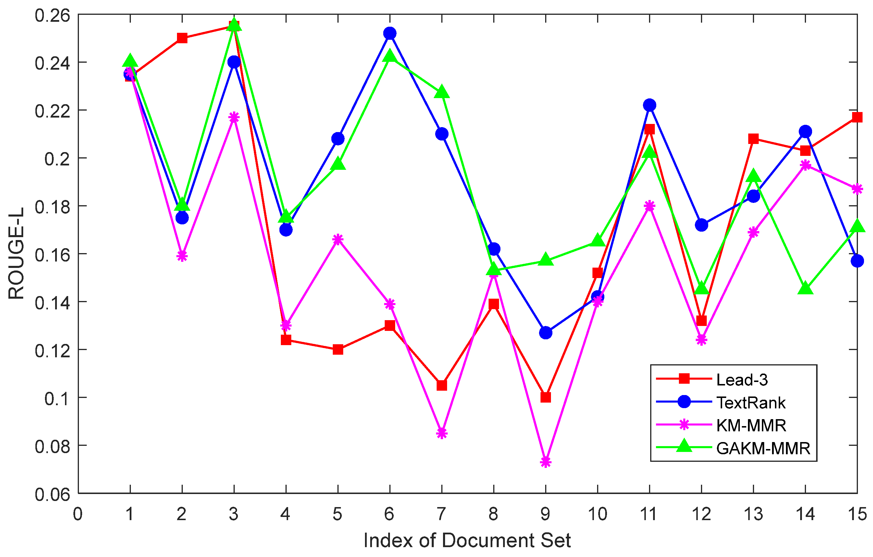 Figure 5, the average ROUGE-L scores of the four automatic summary methods including Lead-3, TextRank, KM-MMR, and GAKM-MMR are 0.172, 0.191, 0.157, and 0.19, respectively. The average ROUGE-L score of the GAKM-MMR method is close to the TextRank method, and is increased by 10.27% and 20.9% compared with the Lead-3 method and KM-MMR method, respectively.