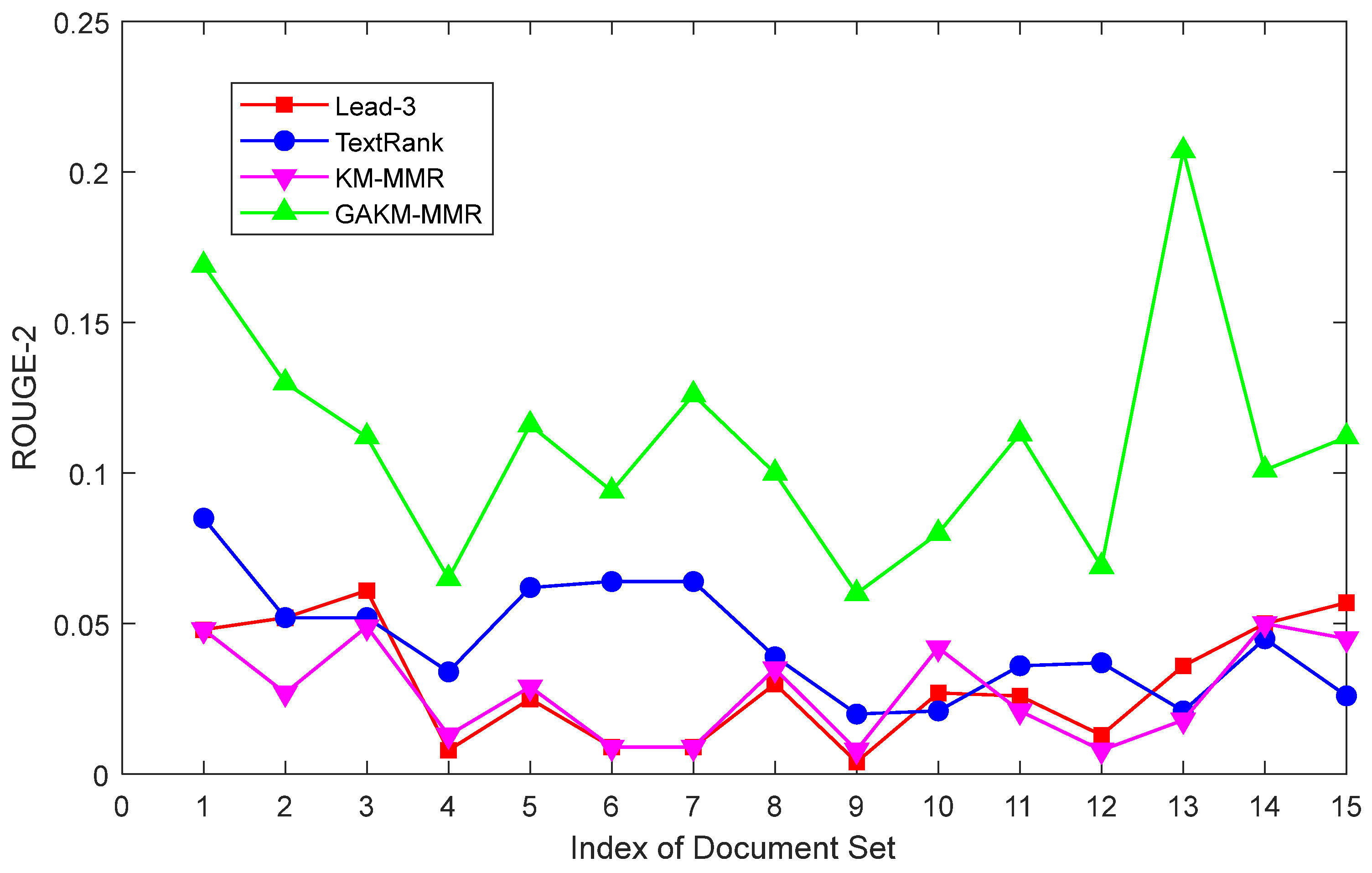 Figure 4, the average ROUGE-2 scores of the four automatic summary methods including Lead-3, TextRank, KM-MMR, and GAKM-MMR are 0.03, 0.044, 0.027, and 0.11, respectively. The average ROUGE-2 score of the GAKM-MMR method is increased by 2.64 times, 1.51 times, and 3.02 times compared with the other three automatic summary methods, respectively.