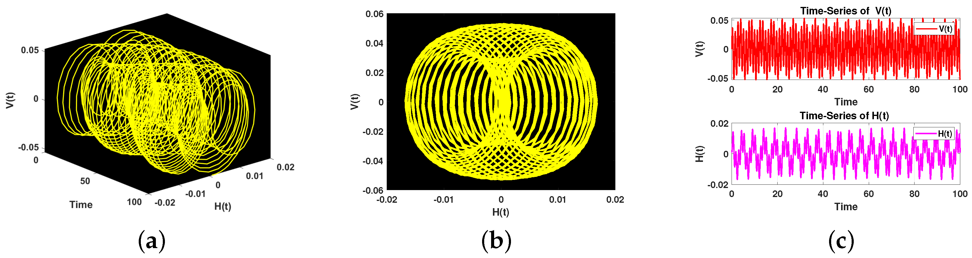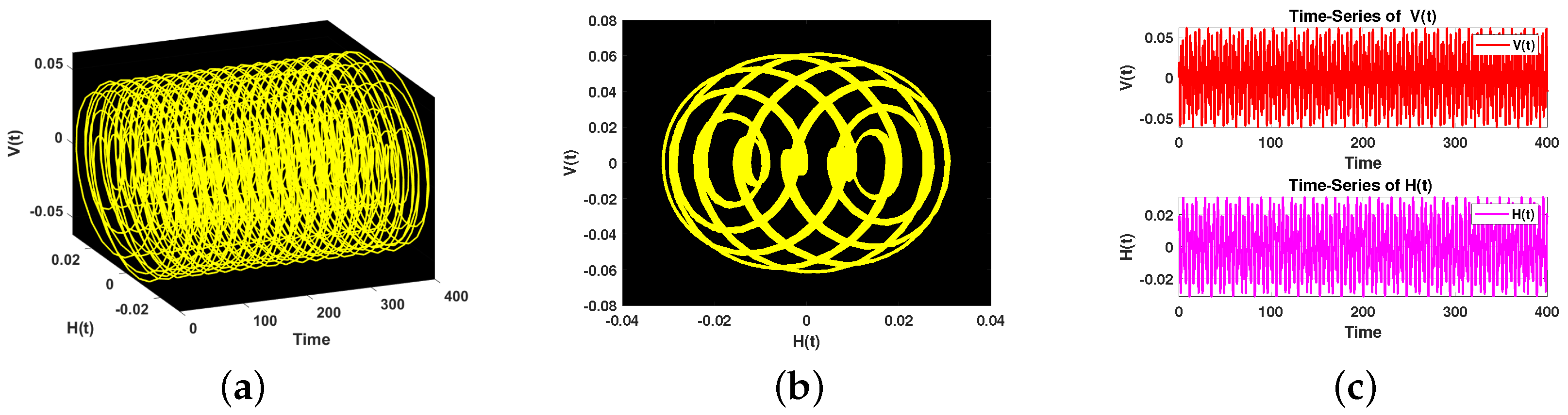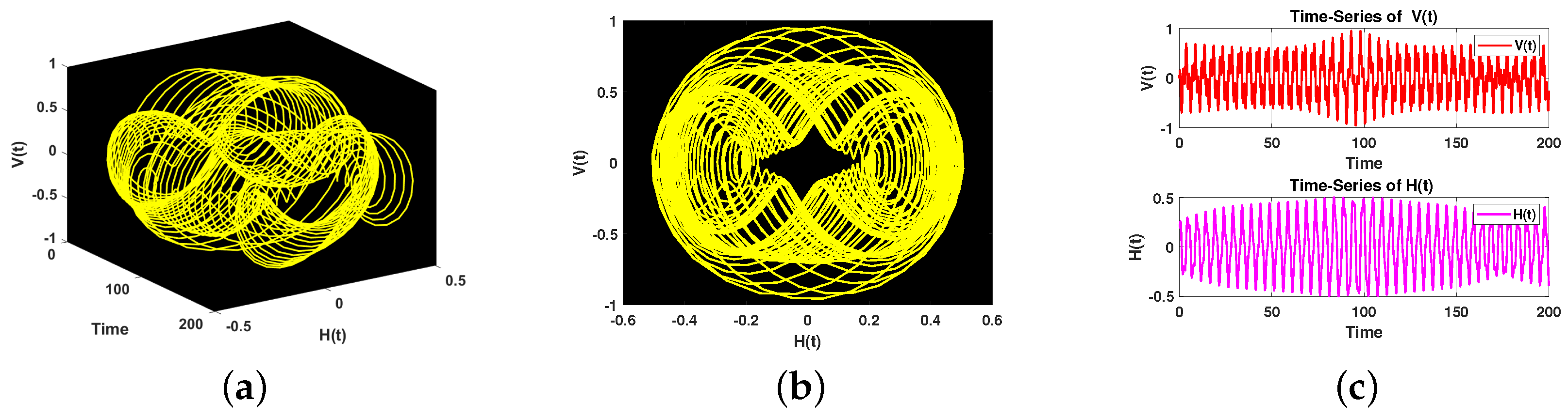 - Farooq, K.; Abdullah, A.R.; Hussain, E.; Murad, M.A.S. Chaos, Lyapunov Exponent, and Sensitivity Demonstration of the Coupled Nonlinear Integrable Model with Soliton Solutions. AIMS Math. 2025, 10, 22929–22957. [Google Scholar] [CrossRef]