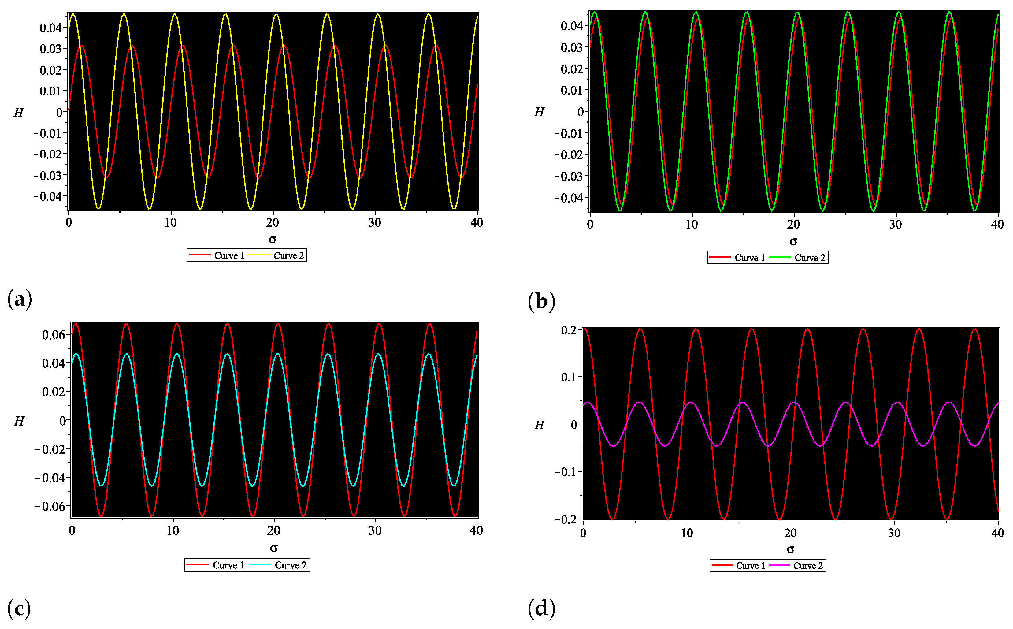 - The function as a function of the time-like parameter , given various pairs of beginning values. Notwithstanding the minor discrepancies in initial conditions, the resultant trajectories demonstrate significantly divergent behaviors, particularly in panels (Figure 9c,d), highlighting the system’s sensitive dependency on initial states, an intrinsic characteristic of nonlinear and potentially chaotic systems. The sensitivity is determined by a parameterized model with , and , which presumably delineate the intensity of nonlinearity, damping, and external forcing within the system. As the initial perturbation amplitude escalates, the divergence between curves becomes increasingly evident, especially in amplitude and phase, indicating a shift from near-linear to markedly nonlinear dynamics. This approach is essential for comprehending the robustness, predictability, and long-term behavior of physical systems represented by differential equations in several domains, including mechanical oscillations and wave propagation in nonlinear media.