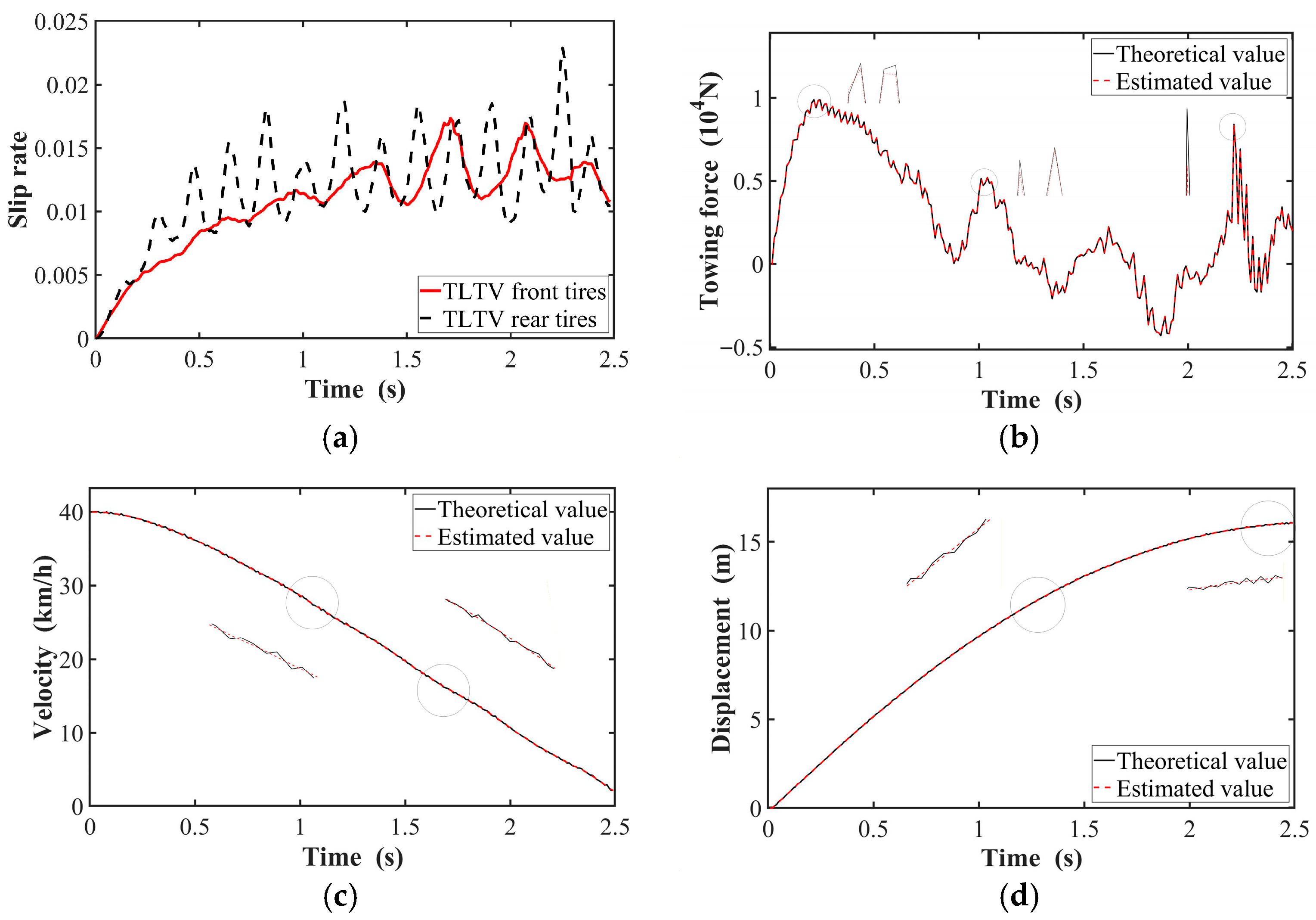 - Based on the refined symmetrical dynamic model of the AEOTTS, the follow-up estimator can effectively predict the state changes of the AEOTTS. The maximum error between the estimated and theoretical values of aircraft traction force is 2.7%. Under the follow-up braking control mode, the tire slip rate of the TLTV initially increases and then stabilizes with oscillations, with the front wheels demonstrating superior control performance.