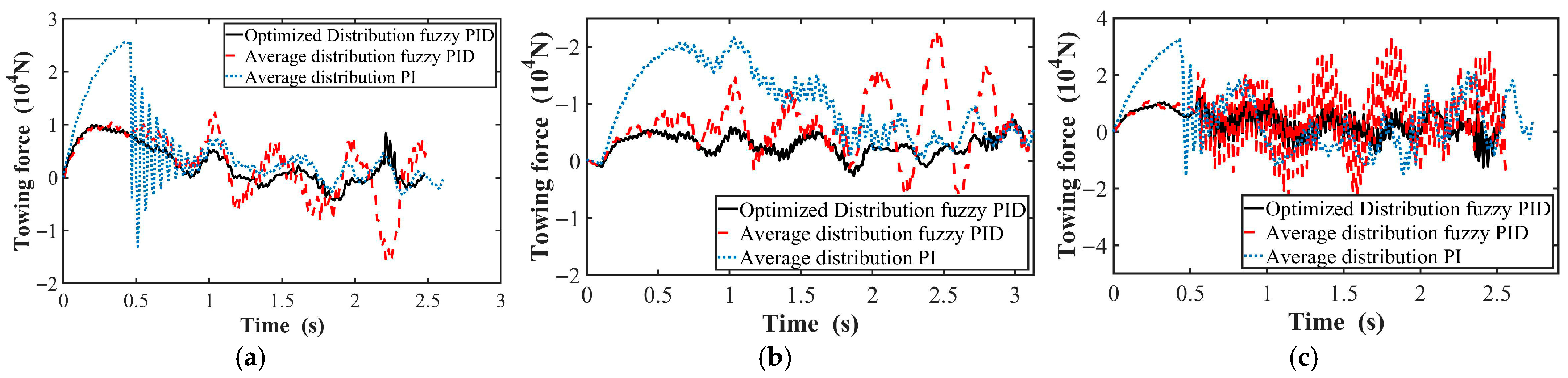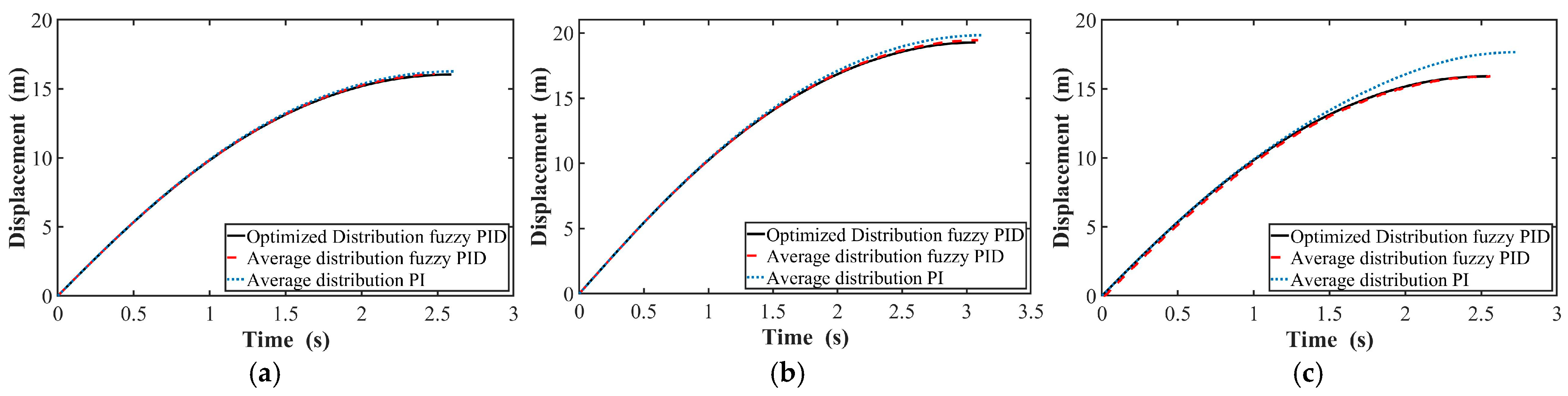 - Under three braking conditions considering road adhesion coefficient and runway unevenness, the braking performance of the AEOTTS was compared across three follow-up control modes: average distribution PI control, average distribution fuzzy PID control, and optimized distribution fuzzy PID control. The fuzzy PID follow-up control system based on optimized distribution significantly reduced the towing force on the aircraft’s NLG, with the peak towing force decreasing by up to 68.9% and the RMS value of the force by up to 70.9%. Additionally, the braking distance of the AEOTTS was reduced by up to 9.9%.