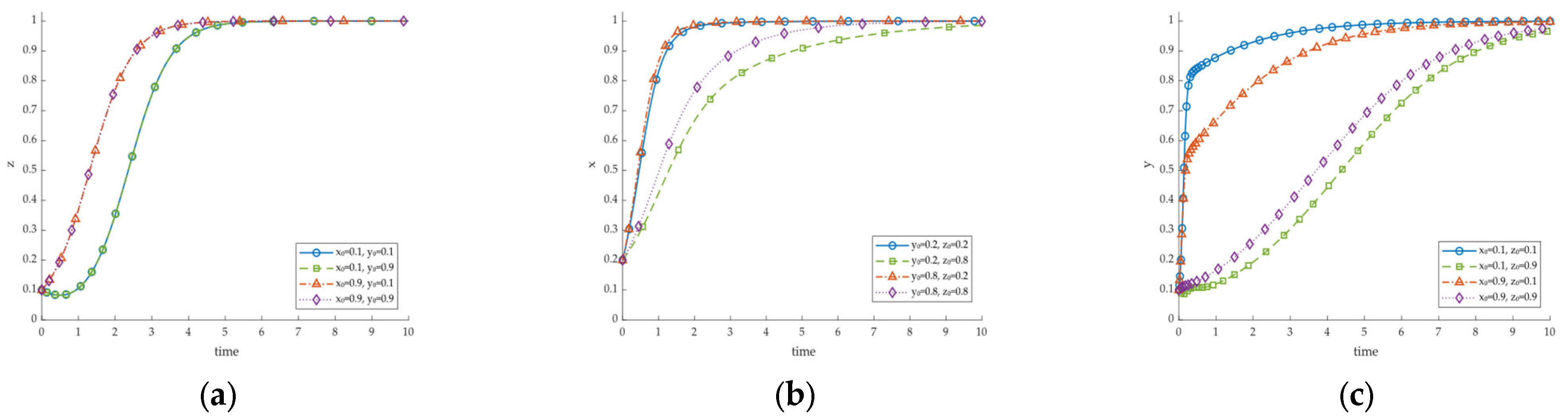 | E1(0, 0, 0) | ?, ?, + | unstable | −, −, − | ESS | +, ?, + | Saddle | ?, +, − | unstable |