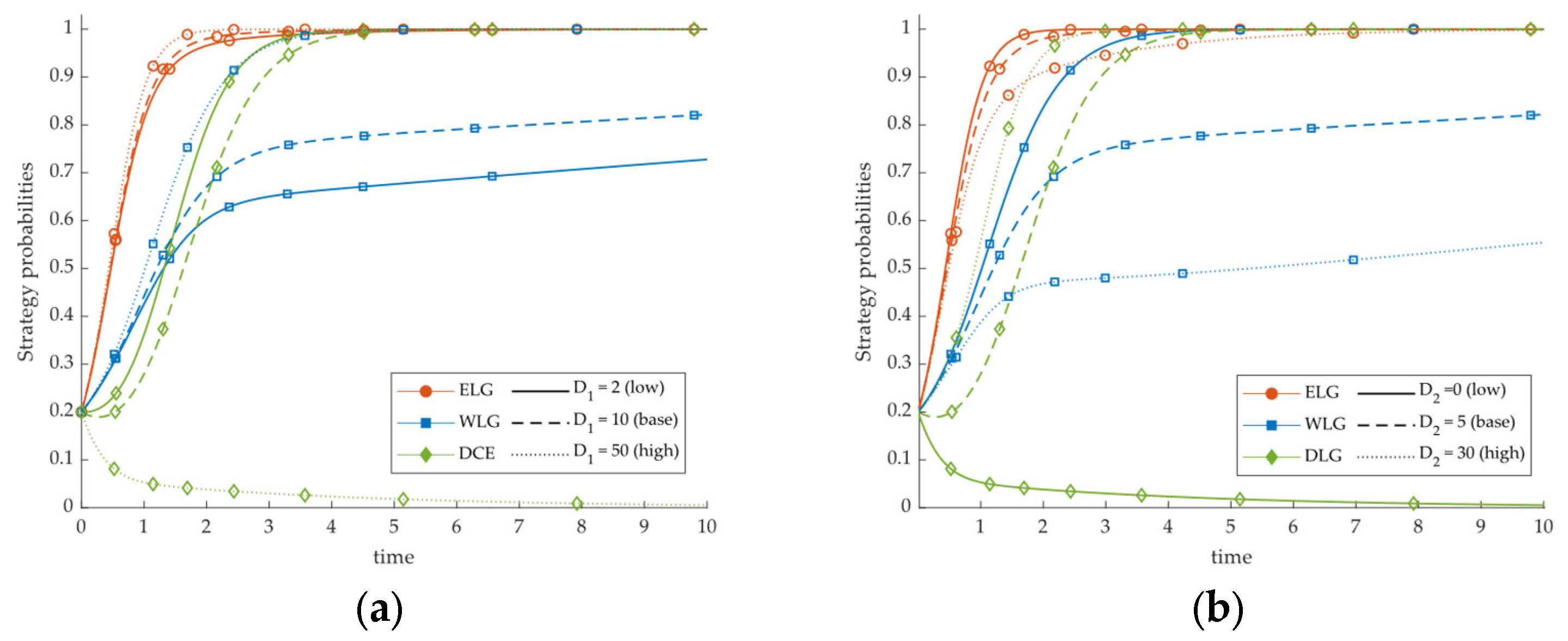 3.5. Expected Payoff Functions and Replicator-Dynamics Equations