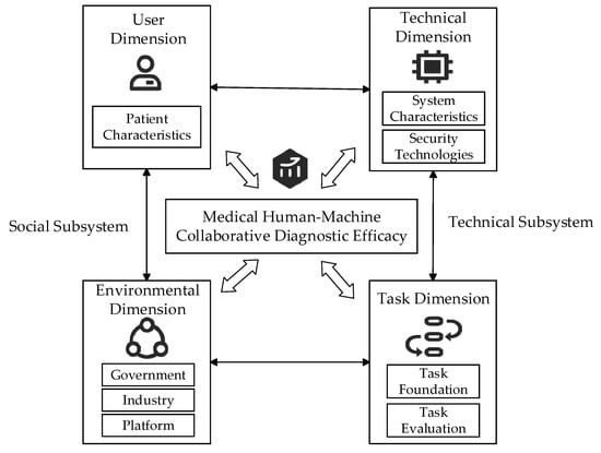 In the field of medical human–machine collaborative diagnosis, multi-dimensional influencing factors need to be considered. It is necessary to not only focus on the role of patients’ behaviors in diagnostic effectiveness, but also further incorporate the characteristics of medical intelligent systems, practical evaluation of task effectiveness, and multi-dimensional impacts of environmental factors. Socio-technical Systems Theory provides an effective analytical framework for understanding and optimizing diagnostic effectiveness, as well as for promoting sustainable health services. Sustainable healthcare services have multiple requirements for AI medical intelligent systems. They not only require the systems to have high accuracy and efficiency in diagnosis, but also emphasize their long-term resilience, broad accessibility, and service quality stability under resource constraints [41]. Therefore, a systematic perspective is required when analyzing the effectiveness of medical human–machine collaborative diagnosis. In addition to focusing on patients’ cognitive behaviors, system technical levels, and task complexity, external environmental factors must be incorporated into the scope of consideration. To more accurately reflect the actual scenario of medical human–machine collaboration, this study deepens the dimensions of the Socio-technical System Theory. It refines the “structural dimension” in the social subsystem into the “environmental dimension”. Specifically, the efficacy of human–machine collaborative diagnosis in healthcare is jointly influenced by four dimensions: users, technology, tasks, and environment. As core users, patients provide medical data through interaction with medical intelligent systems. The systems are responsible for processing data, generating diagnostic results, and providing personalized services. This process must operate within the constraints of governmental, industry, and platform-specific regulations to ensure diagnostic compliance and safety.