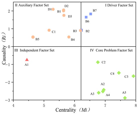 Having established the comprehensive influence matrix, calculate the degree of influence Di, degree of being influenced Bi, centrality Mi, and causality Ri for each influencing factor according to Equations (3)–(6). The degree of influence represents the aggregated influence value of each row factor in the comprehensive impact matrix on all other elements. The degree of being influenced represents the aggregate impact value of each factor on all other factors. Centrality is the sum of the impact and being-influenced degrees of each factor, reflecting the significance of the factor within the overall system relationship. Causality is the difference between the influence degree and being influenced degree corresponding to each factor, indicating the extent to which the factor affects the system as a “cause” or its contribution degree. That is, it represents the degree of logical relationship between each factor and other factors.